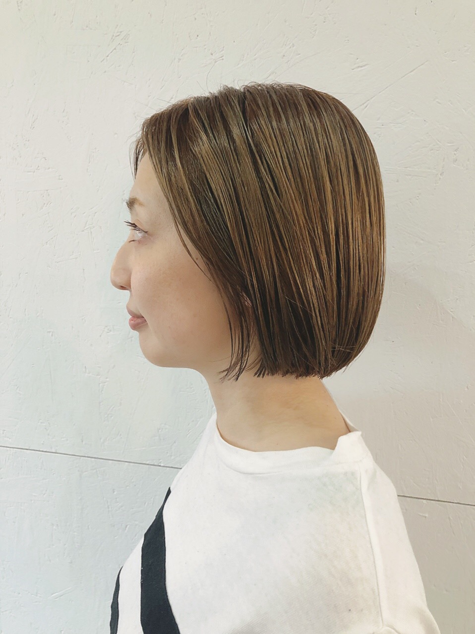 プツッとカットしたボブに少し明るめのイエロー系のべージュカラー。